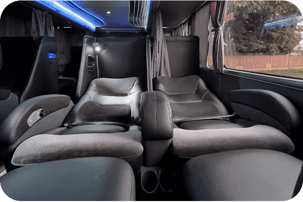 Categoria disponível em veículos de dois andares ou de piso único. Você conta com água em garrafa sempre fresquinha na geladeira. A reclinação das poltronas varia de 111º a 135º e o espaçamento entre 21 e 41 cm. O apoio para pés e pernas também está presente, assim como ar-condicionado, banheiro, wi-fi gratuito e USB individual.